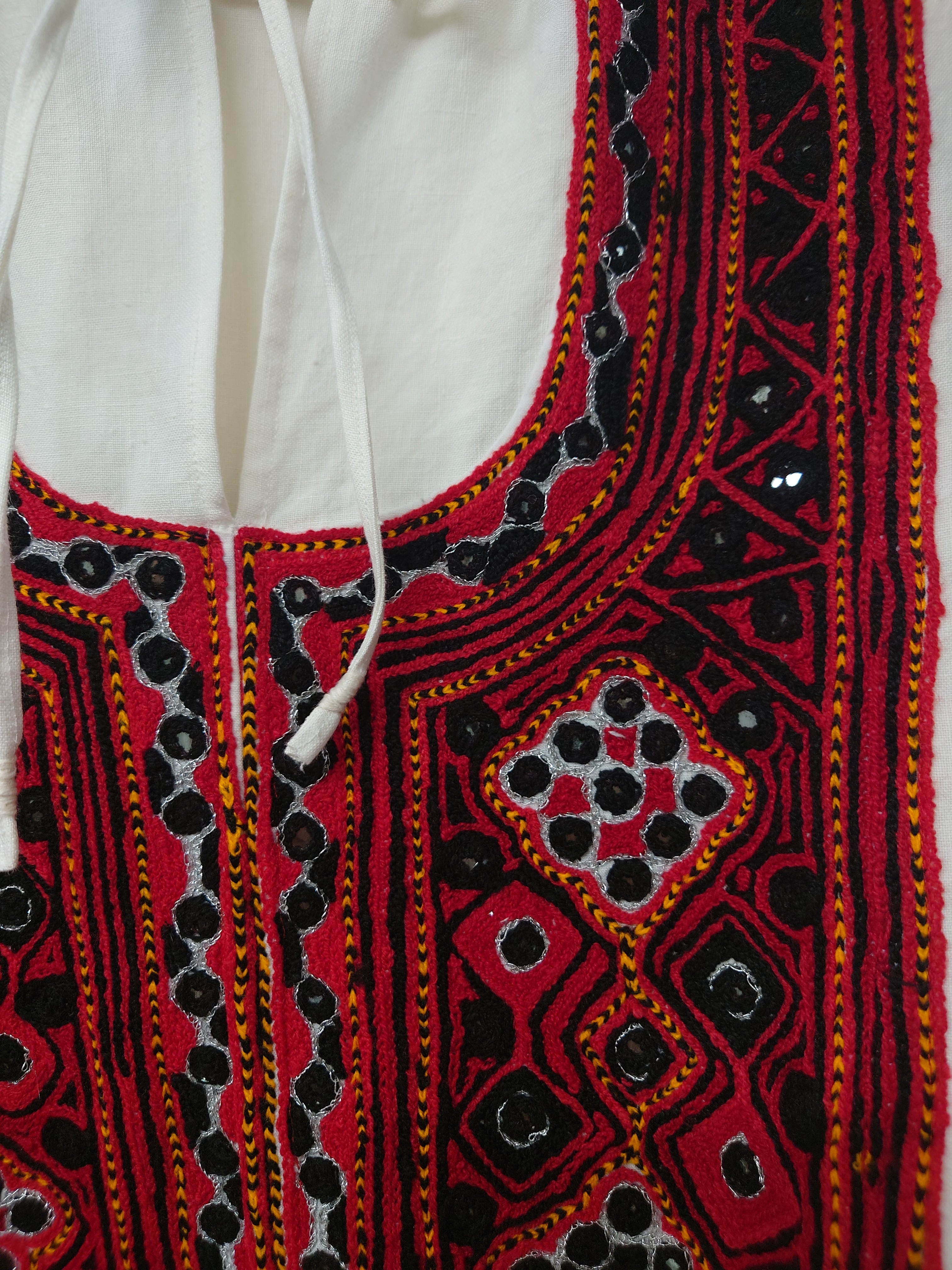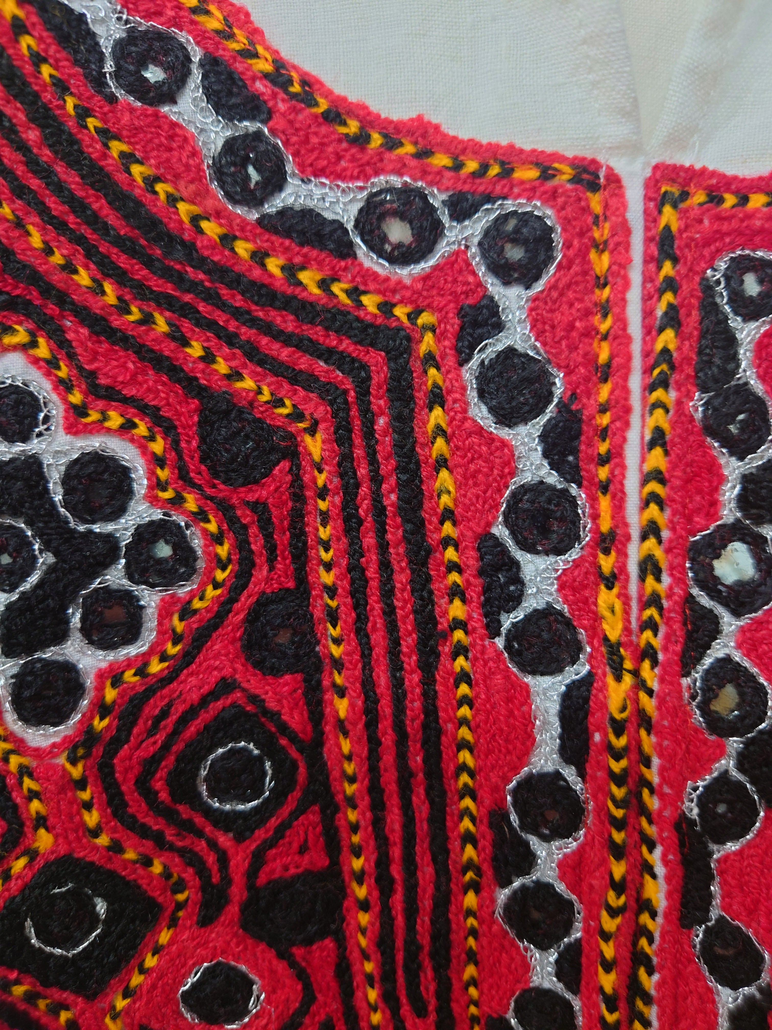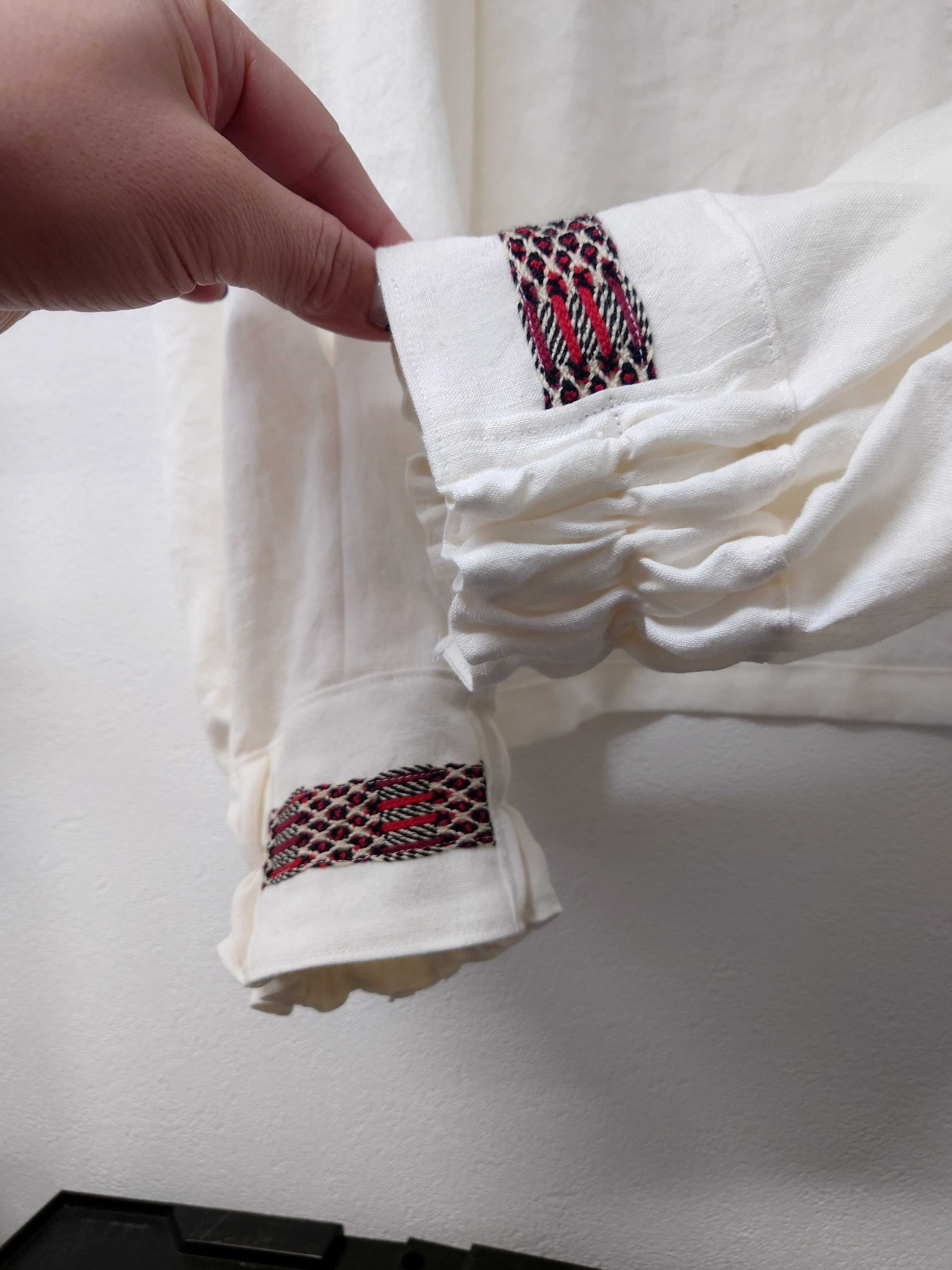 胸元に施された鮮やかな赤と黒の幾何学模様のミラー刺繍が目を引く、民族調のナチュラルブラウスです。リネンの柔らかな生成り生地に、手仕事の温もりを感じられる細かな刺繍が映える一着。ゆったりとしたシルエットと、袖口のギャザーが、クラシカルな雰囲気を演出します。